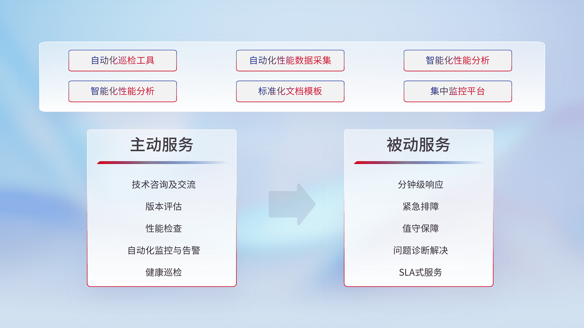 智能化工具和标准化文档,,,,保障服务质量,,提供主动服务(包含技术咨询、、、、版本评估、、、、性能检查、、、自动化监控与告警、、健康巡检)和被动服务包含(分钟级响应、、、、紧急排障、、、值守保障、、、问题诊断解决、、、、SLA服务)。。
