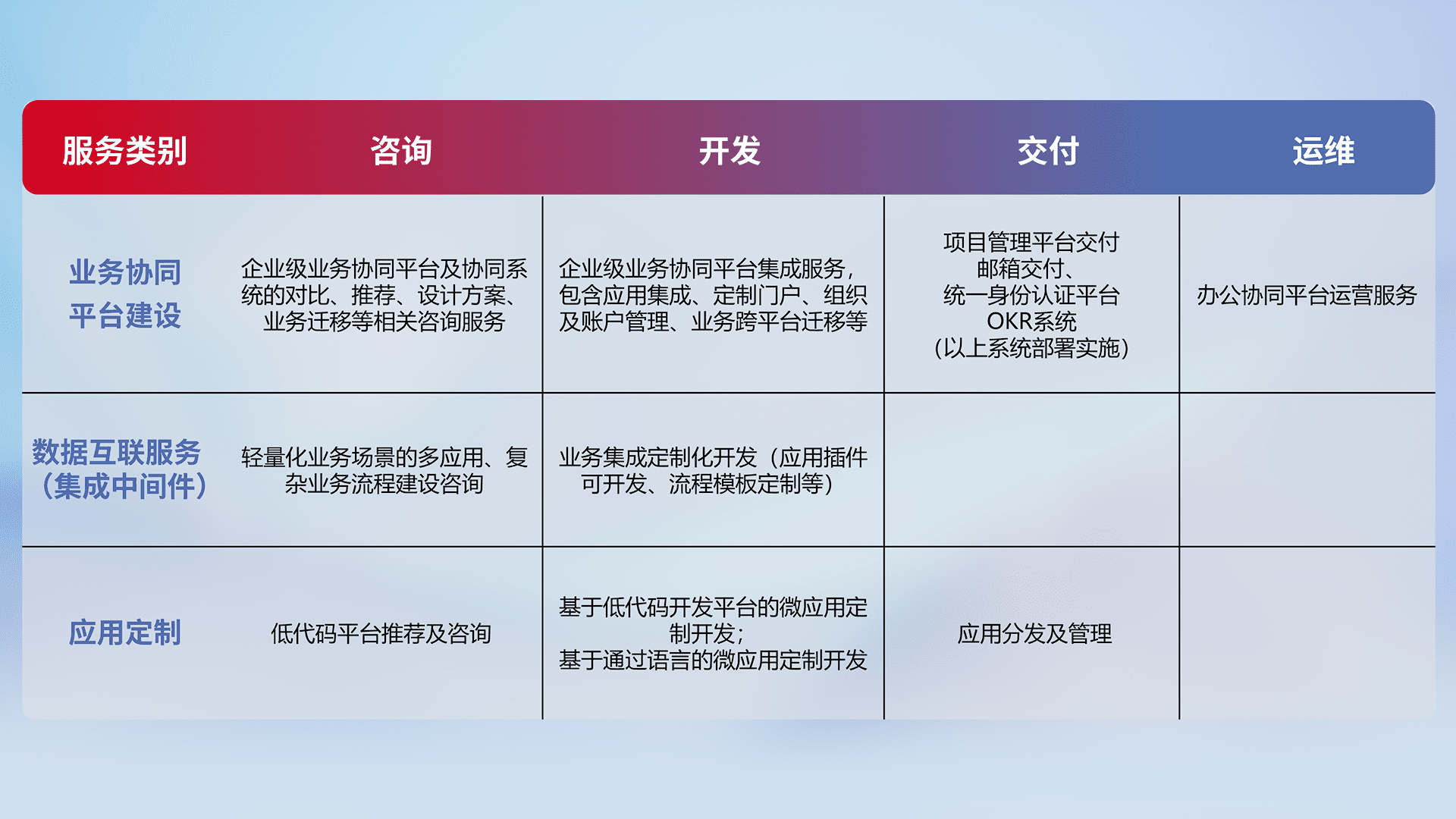 针对钉钉、、、企微、、、、IDaas等平台级产品提供产品的规划、、、方案、、、、交付、、、定制化开发等服务,,,实现如统一协同办公、、、智能客户服务、、混合会议管理、、智能数据查询、、、、等业务场景,,,,实现数字化转型。。